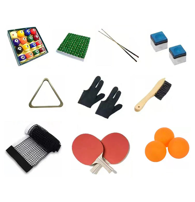 - Comes with 8/9 Ball Set, Triangle, 2 Wooden Pool Cues, 50 Cue Tips, Gloves, Surface Brush and 2 Tip Chalks