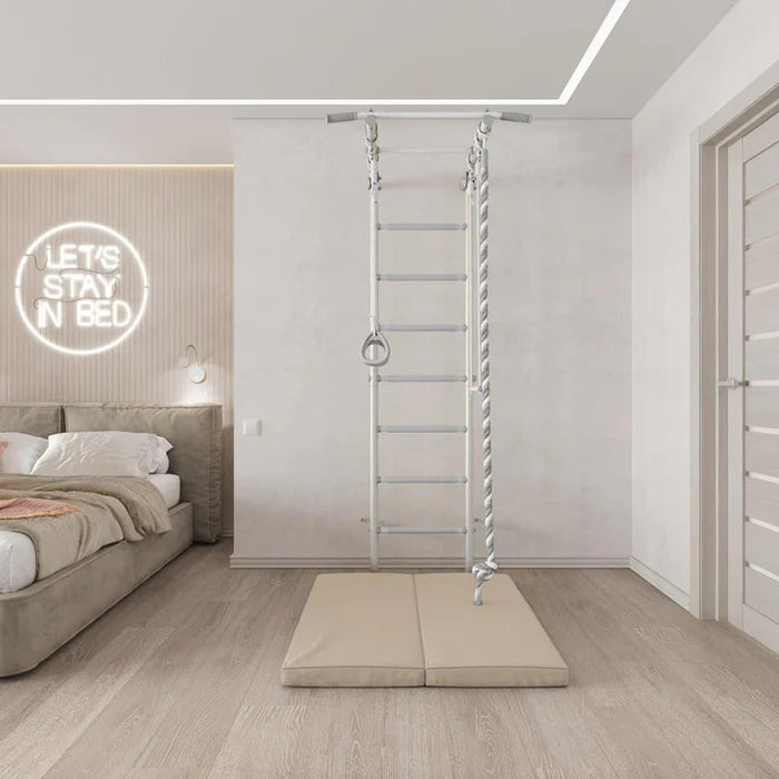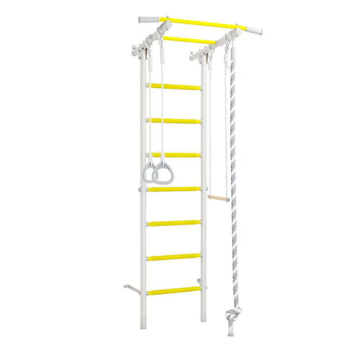 - Comes with a Rope climber, Gymnastics Rings, Trapeze and Chin up bar