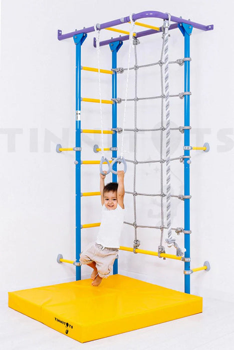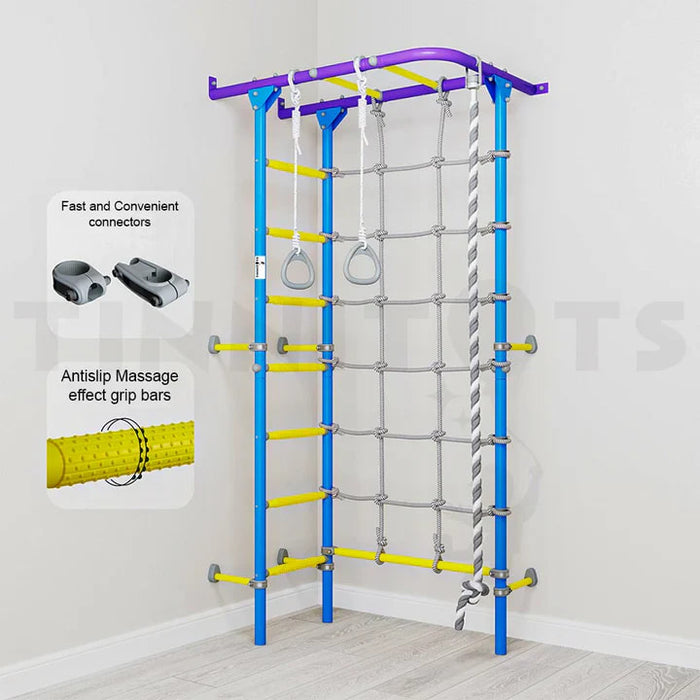 Swedish Corner Wallbars - S4 is a climbing frame for corner walls, designed specifically for homes or centres where space is a constraint. This playset comes with monkey bars, massage effect ladders to climb on, a rope climber, gymnastics rings and a spider net. The overall structure can withstand a weight of up to 100 kg (test load - 200 kg).