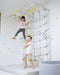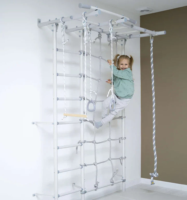 Swedish Giant Wallbars - S7 playset has everything your young adventurer needs to explore and challenge their abilities. It incorporates a spider net, monkey bars, a pair of gymnastics rings, and more, making it a perfect place to spend time on a rainy day for children both young and old. You can further expand by adding an additional accessory of Monkey Bars.